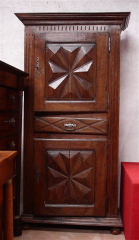 ARMOIRE HAUTE à doucine dite homme debout en chêne mouluré. Décor en façade de panneaux sculptés de croix de Malte et de larges cannelures sur les montants. Elle ouvre à deux battants encadrant un tiroir, et repose sur une doucine inversée, elle même suportée par quatre pieds miche.
