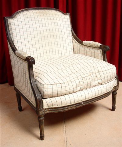 BERGÈRE - MARQUISE à dossier en anse de panier, en bois noirci mouluré et sculpté. Les supports d'accotoir galbés, reposent sur des dés de raccordement sculptés de fleurettes. Les pieds, fuselés, sont cannelés.