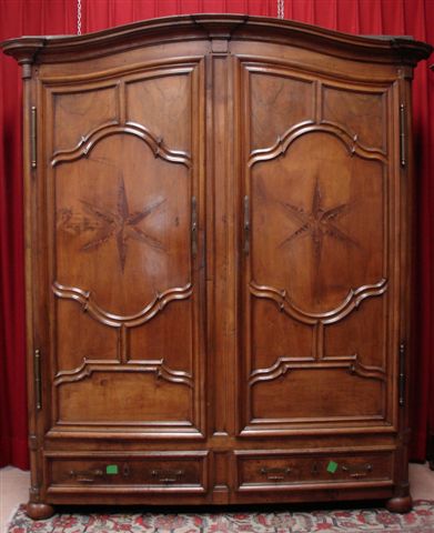 ARMOIRE LORRAINE en noyer mouluré. Elle ouvre par deux vantaux à compartiments, marquetés d'étoiles, séparés par un dormant et deux tiroirs dans la partie inférieure. La corniche, fortement moulurée, est en anse de panier, les montants arrondis. Elle repose sur des pieds boule.