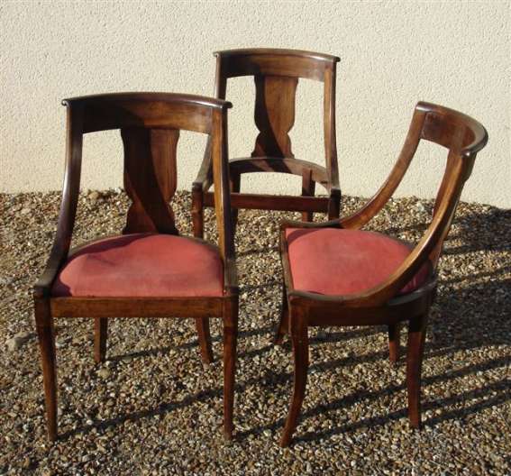 Suite de TROIS CHAISES GONDOLE en placage d'acajou. Dossier ajouré.