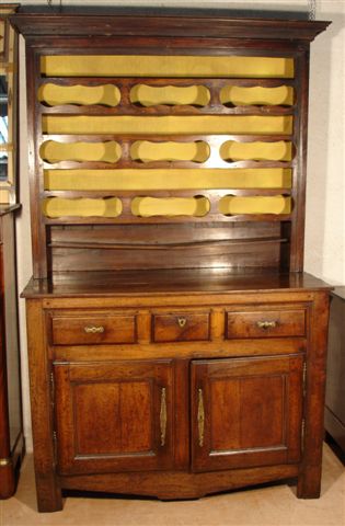 VAISSELIER rustique de forme rectangulaire en chêne mouluré. Sa partie supérieure présente trois rangs de gradins. La partie inférieure ouvre à trois tiroirs sur un rang et deux vantaux moulurés. Flancs panneautés. Pieds droits.