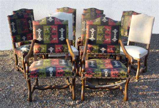 SUITE DE HUIT CHAISES et de DEUX FAUTEUILS en bois naturel de style Louis XIV. Dossier en anse de panier. Entretoise en "H". Pieds en enroulement. (états divers)