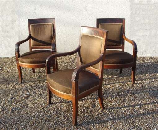 Suite de TROIS FAUTEUILS en acajou et placage d'acajou mouluré et sculpté. Dossiers cabriolet terminés par un enroulement. Accotoirs à feuilles de lotus.