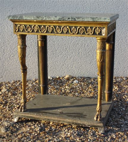 CONSOLE BASSE, en bois laqué noir mouluré, sculpté, et doré. Plateau rectangulaire repose sur une ceinture à entablement sculpté d'agrafes entourant des palmettes dorées sur fond noir. Piètement antérieur doré de jarrets griffus cannelures torses dans leurs parties supérieures. Piètement postérieur en demi-colonnes dorées fuselées et cannelées. L'ensemble repose sur tablette faisant entretoise se terminant dans les angles par de petits pieds. Dessus de marbre.
