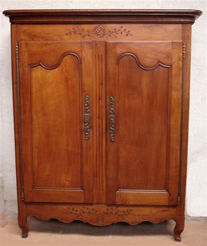 ARMOIRETTE du val de Loire de forme rectangulaire en merisier mouluré et sculpté. Corniche droite. Partie supérieure sculptée d'une croie de Malte entourée de rinceaux. Elle ouvre à deux vantaux moulurés avec un faux dormant. Ceinture chantournée sculptée de rinceaux. Pieds cambrés.