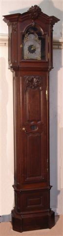 HORLOGE de parquet de forme rectangulaire à pans coupés en chêne mouluré et sculpté. Fronton en anse de panier centré d'une coquille dans un entourage de feuilles d'acanthe. Caisse moulurée, sculptée de fleurettes et de feuilles d'acanthe. Socle panneauté. Sonne pour heure, quart, demi et trois-quarts.