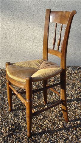 CHAISE paillée en bois naturel. Dossier ajouré de trois balustres tournées. Pieds antérieurs tournés, pieds postérieurs sabre. Entretoise tournées.