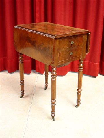 TABLE de NUIT en acajou et placage d'acajou mouluré. Elle ouvre en ceinture à deux tiroirs sur deux rangs, un vide-poche, de l'autre côté, à un abattant découvrant un casier. Elle repose sur quatre pieds tournés, alternés d'une section octogonale fuselée. Roulettes.