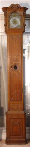 HORLOGE de parquet en chêne mouluré et sculpté. Fronton en agrafes affrontées orné d'une guirlande de feuilles de laurier. Partie supérieure à pans coupés ornés de consoles. Caisse sculptée d'accolades et de fleurettes. Socle panneauté et sculpté d'un linge tombant. Mouvement signé E.Mallien 1786.