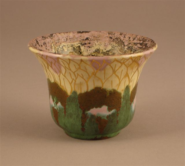GOBELET en céramique. Couverte brune et verte à la base, le col orné de feuilles dorées sur fond rose.