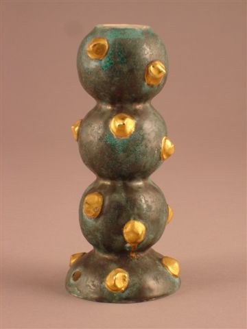 PIED DE LAMPE en céramique polychrome. Fût constitué de trois bulbes gris-verts ornés d'ergots dorés.