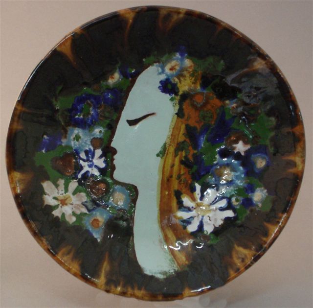 ASSIETE en céramique. Décor d'un profil féminin entouré de fleurs dans le bassin.