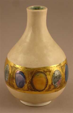VASE à col étroit en céramique. Panse ornée d'une frise de médaillons sur fond doré.