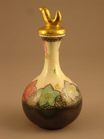 CARAFE en céramique. Sommée d'un bouchon figurant un oiseau doré en ronde bosse. Panse ornée d'une frise de fleurs. Signée au revers.