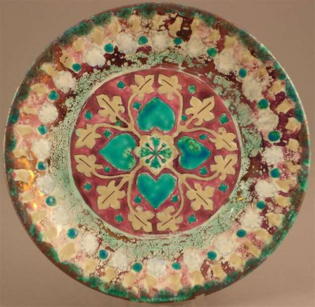 ASSIETTE en céramique. Bassin centré d'un motif de feuillages et de rinceaux stylisés sur fond rose. Aile mouchetée. Joint, un calque préparatoire.