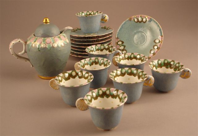 SERVICE Á THÉ comprenant une théière, huit tasses et leurs soucoupes. Décor de médaillons blancs et roses sur un fond bleu vert.