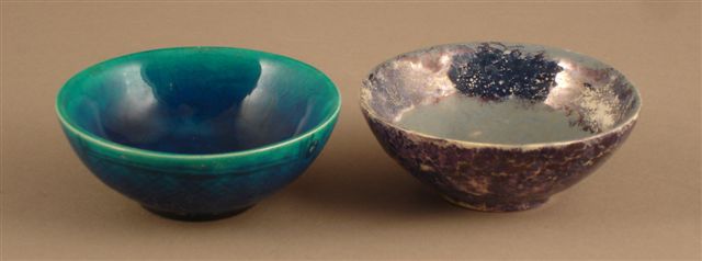 Ensemble de deux COUPES en céramique. L'une à la couverte turquoise craquelée, l'autre à la couverte bleue aux reflets métalliques.