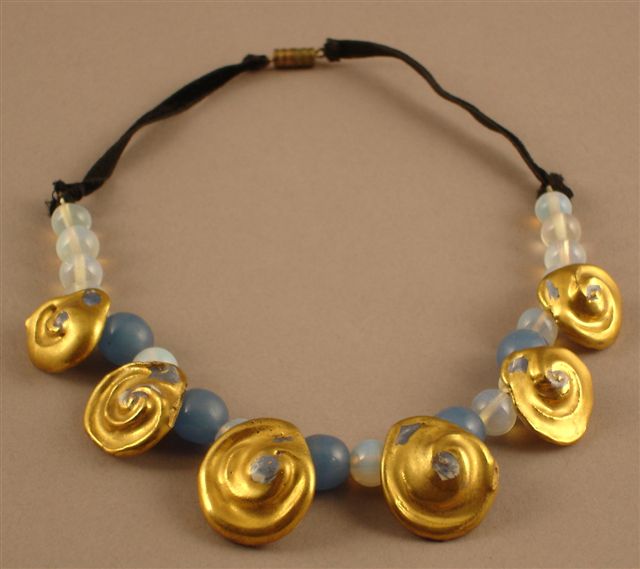 COLLIER constitué de perles de verre et de coquilles en céramique dorée.