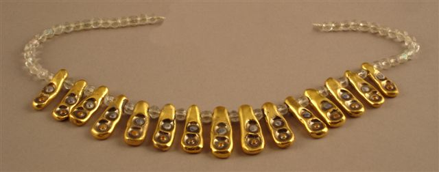 COLLIER constitué de quinze pendeloques de céramique dorée ornées de cabochons colorés.