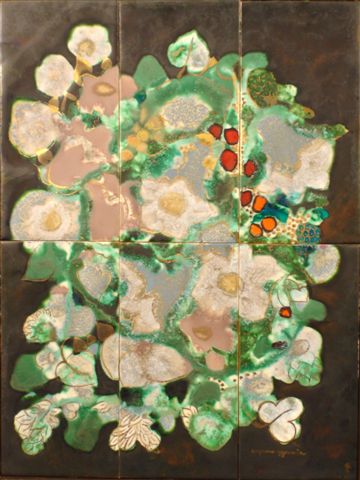 Bouquet de fleurs. MOSAÏQUE de six carreaux de céramique. Signée en bas à droite.