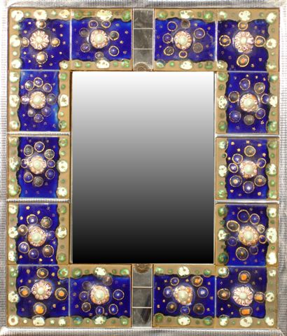 MIROIR à encadrement de 14 carreaux de céramique ornés de cabochons sur fond bleu.