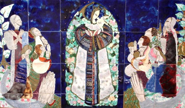 "Prière pour la Paix". MOSAÏQUE de 24 carreaux de céramique. Porte au revers une étiquette manuscrite "Salon de l'Île de france, Prière pour la Paix". Signée en bas au centre.