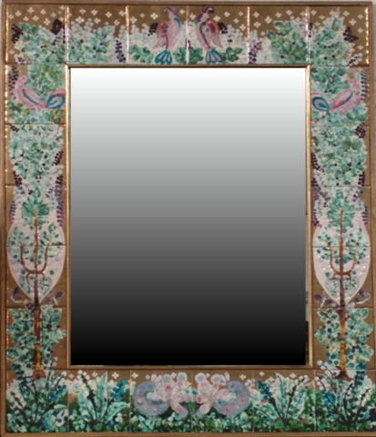 MIROIR de forme rectangulaire à encadrement de 22 carreaux de céramique figurant deux arbres fleuris peuplés d'oiseaux.