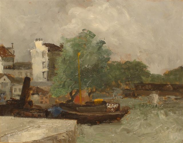 Bateaux à quai. Huile sur carton. Signée au dos.27 x...
