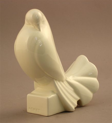 ADNET Jaques. Colombe queue de paon stylisée en faïence vernissée. Socle quadrangulaire signé sur le devant, dans la pâte.