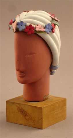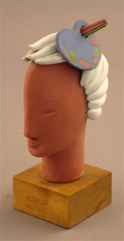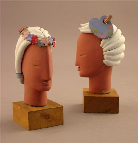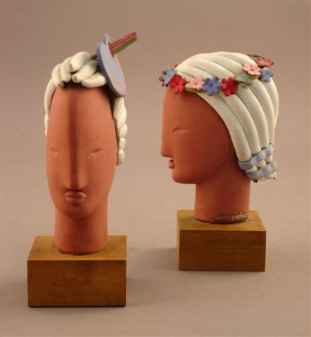 GUEDEN Colette pour PRIMAVERA, attribués à. "Apollon" et "Terpsichore". Paire de figures en terre cuite polychrome. Les visages stylisés, Apollon, dieu des Arts, porte dans ses cheveux la palette du peintre garnie de cinq pinceaux; Terpsichore, muse de la danse, arbore une couronne de leurs dans sa coiffure.
