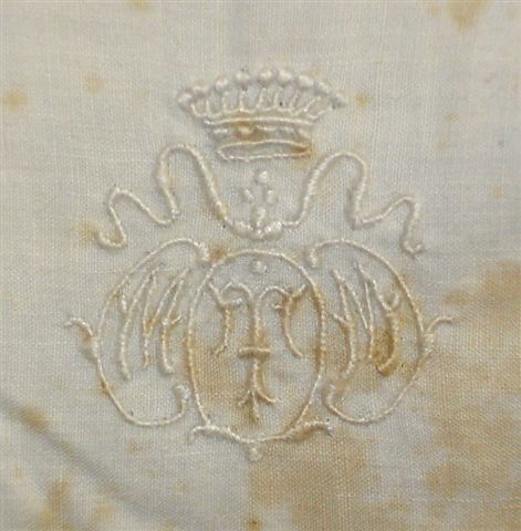 Réunion de CHEMISES DE NUIT en fil, chiffre brodé MTM sous une couronne de comte, broderie anglaise. (Importantes tâches d'humidité.) Sept pièces.