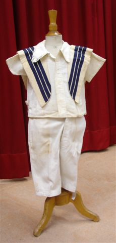TENUE DE PETIT MARIN pour jeune garçon. Une vareuse nid d'abeille blanc, culotte en sergé blanc et divers rabats.