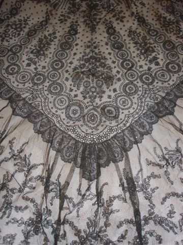 CHÂLE EN POINTE en Chantilly noire bordé d'un volant de Chantilly noir. 100 x 215 cm.