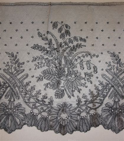 VOLANTen Chantilly noire, décor de gerbes de fleurs au dessus de bâtonnets. 29 x 900 cm.