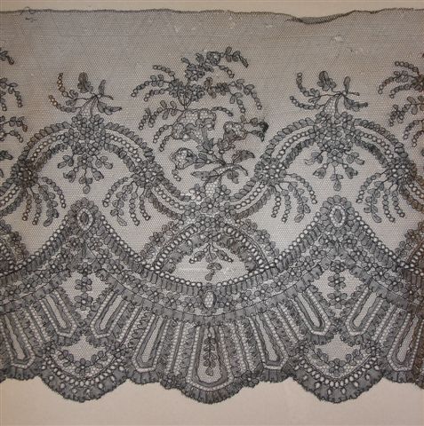 VOLANT de dentelle en Chantilly noire. Décor de fleurs au dessus de rubans et draperies. 800 x 33 cm.