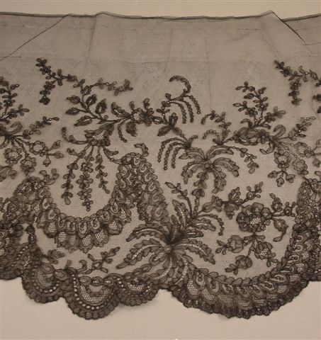 VOLANT de dentelle en Chantilly noire avec décor de gerbes de fleurs. 50 x 548 cm.