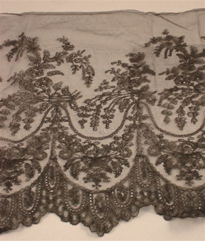 VOLANT en dentelle de chantilly noire à décor de gerbes de fleurs, rubans perlés et draperies. 50x 380 cm.