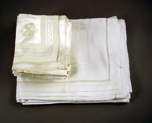NAPPE et ses 12 SERVIETTES de table assorties damassées à décor de grecques en frise. Jours échelle en bordure. Monogrammées JP.