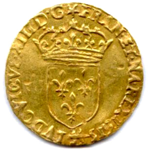 Écu de France couronné surmonté d'un soleil. Légende commençant à 6h. Lézard initial. Millésime en fin de légende. R/. Croix aux bras torsadés et fleurdelisés. Lettre d'atelier en cur. Croisette initiale.