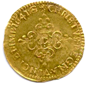 Écu de France couronné. Soleil initial. R/. Croix aux bras torsadés et fleurdelisés. Lion initial. Lettre d'atelier en cœur entourée de quatre points. Millésime et G étoilé en fin de légende.