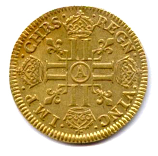 Tête laurée du roi enfant, avec la mèche courte. Dessous, millésime. Couronne de laurier avec baies. R/. Croix formée de huit L couronnés cantonnée de quatre lis. Au centre, lettre d'atelier. Légende commençant à 9h.