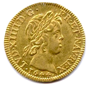 Tête laurée du roi enfant, avec la mèche courte. Dessous, millésime. Couronne de laurier avec baies. R/. Croix formée de huit L couronnés cantonnée de quatre lis. Au centre, lettre d'atelier. Légende commençant à 9h. Petite croix sous le point après CHRS.