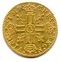 Tête laurée du roi enfant, avec la mèche courte. Dessous, millésime. Couronne de laurier avec baies. R/. Croix formée de huit L couronnés cantonnée de quatre lis. Au centre, lettre d'atelier. Légende commençant à 12h.