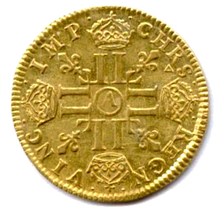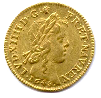 Tête laurée du roi enfant, avec la mèche longue. Dessous, millésime entre deux points (1649 avec un 9 sur un 8). Au-dessus de la tête, fleur à huit pétales. Point sous le 4e I de XIIII. Sans baies. R/. Croix formée de huit L couronnés cantonnée de quatre lis. Au centre, lettre d'atelier. Légende commençant à 12h. Triangle sous le R de CHRS.