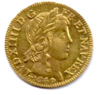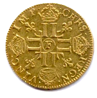 Tête laurée du roi enfant, avec la mèche longue. Trèfle en début de légende. Millésime sous la tranche du cou. Sans baies. R/. Croix formée de huit L couronnés cantonnée de quatre lis. Au centre, lettre d'atelier. Légende commençant à 12h.