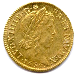 Tête laurée du roi enfant, avec la mèche longue. Dessous, millésime entre deux points. Au-dessus de la tête, fleur à huit pétales. Point sous le 4e I de XIIII. Sans baies. R/. Croix formée de huit L couronnés cantonnée de quatre lis. Au centre, lettre d'atelier. Légende commençant à 12h. Triangle sous le R de CHRS.