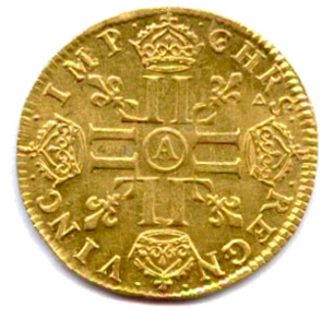 Tête laurée du roi enfant, avec la mèche longue. Dessous, millésime entre deux points. Au-dessus de la tête, fleur à huit pétales. Point sous le 4e I de XIIII. Couronne avec baies. R/. Croix formée de huit L couronnés cantonnée de quatre lis. Au centre, lettre d'atelier. Légende commençant à 12h. Triangle sous le R de CHRS.