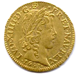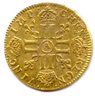 Tête laurée du roi enfant, avec la mèche longue. Dessous, millésime entre deux points. Au-dessus de la tête, fleur à huit pétales. Sans baies R/. Croix formée de huit L couronnés cantonnée de quatre lis. Au centre, lettre d'atelier. Légende commençant à 12h. Triangle sous le R de CHRS.