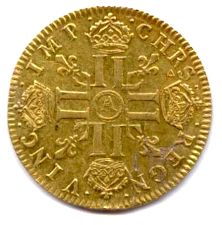 Tête laurée du roi enfant, avec la mèche longue. Dessous, millésime entre deux points. Au-dessus de la tête, fleur à huit pétales. Point sous le 4e I de XIIII. Etoile devant FR. Couronne avec baies. R/. Croix formée de huit L couronnés cantonnée de quatre lis. Au centre, lettre d'atelier. Légende commençant à 12h. Triangle sous le R de CHRS.