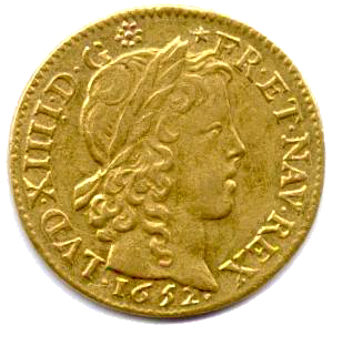 Tête laurée du roi enfant, avec la mèche longue. Dessous, millésime sans points. Au-dessus de la tête, fleur à huit pétales. Point sous le 4e I de XIII et étoile devant FR. Sans baies. R/. Croix formée de huit L couronnés cantonnée de quatre lis. Au centre, lettre d'atelier. Légende commençant à 12h. Triangle sous le R de CHRS.